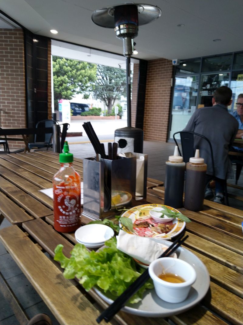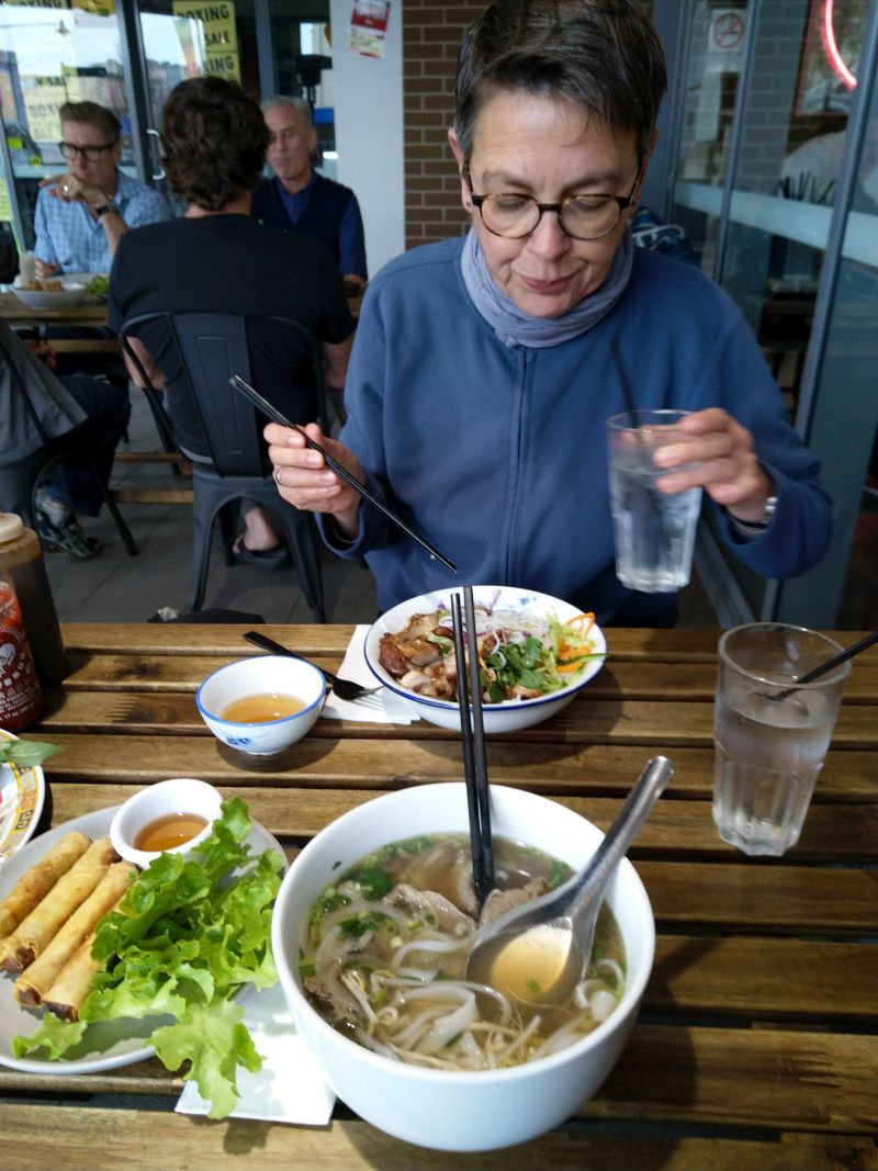 Der Vietnamese an der Ecke hat uns auch schon gefallen, dachten nur Momos bekommt man seltener. Der Vietnamese ist voll und laut, aber das Essen ist gut. Draussen an der Hauptkreuzung ist es vielleicht nicht gerade heimelig aber deutlich ruhiger als drinnen. Ich habe eine riesige Bowl mit Reisnudeln, gekochtem Rindfleisch und ewas Grünzeugs. Elke nimmt den Zitronengras-Nudel-Hühnchen-Salat. Dazu genehmige ich mir noch Frühlingsröllchen. Zwei frischgesprudelte Wasser eines Sodastreamer runden das ganz ab. Wir siten da mit Jacken, Halstüchern, geschlossenen Schuhen und es wird noch der Heizpilz angemacht!!!