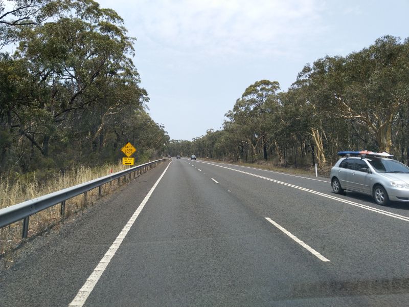 Also weiter Richtung Osten aus den Blue Mountains hinaus. Einen Cafe trinken wir in Glenbrooke, einem heimiligen kleinen Städtchen. Kurz darauf zweigen wir Richtung Südosten ab. Das Autofahren ist recht entspannt auf dem Motorway, von den vielen Baustellen am Anfang mal abgesehen. Alle fahren die vorgeschriebenen 80km und gut ist.