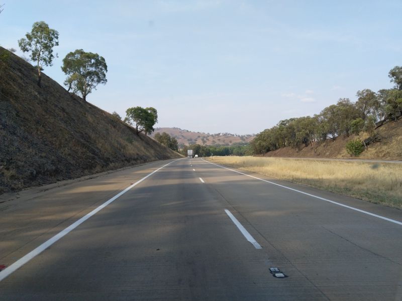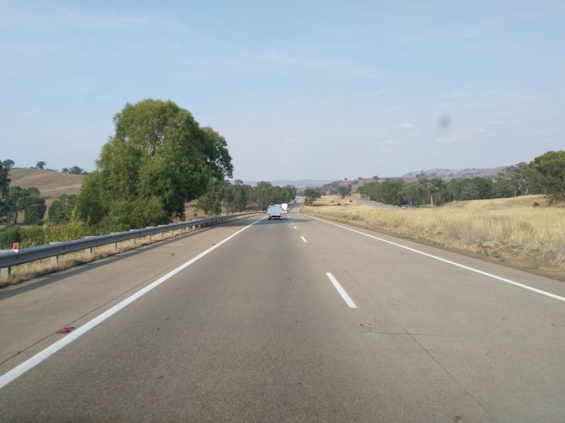 Zunächst geht es auf dem M31 weiter nach Westen. Die Sicht ist mies und rundherum sieht man nur Weiden die verdorrt sind. Wieviel trockenes Grass muss ein Rind oder Schaf essen damit die Energiebilanz wenigstens nicht negativ wird? Die Motorways sind hier wirklich gut. Tempo 110 maximal, an das sich auch alle halten. Laster, Busse, Autos, einfach jeder. Nur Fahrradfahrer nicht und die dürfen tatsächlich diese Autobahnen nutzen. So schaffen wir auch ohne großen Stress die mehr als 400km heute. Eine weitere Besonderheit ist, dass jede Farm eine eigene Zufahrt hat. Es vergeht kein Kilometer ohne eine Abbiegemöglichkeit - nach rechts ohne eigene Spur!