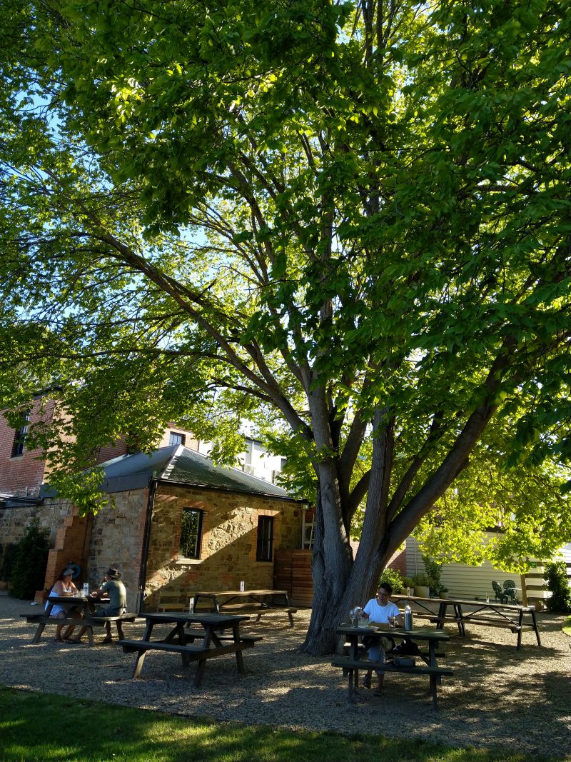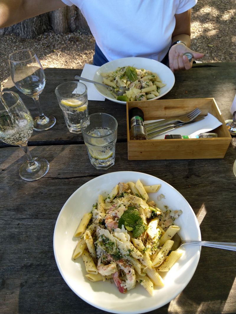 Beim Umherschlendern haben wir einen kleinen Pub gesehen in dem man draussen unter einem grossen Baum essen kann. Da gehen wir hin und bestellen Knobibrot und 2 mal die Seafoodpasta. Wir hatten schon besseres, aber das Ambiente ist unschlagbar; die Luft hat 26°, es ist blauer Himmel!!!