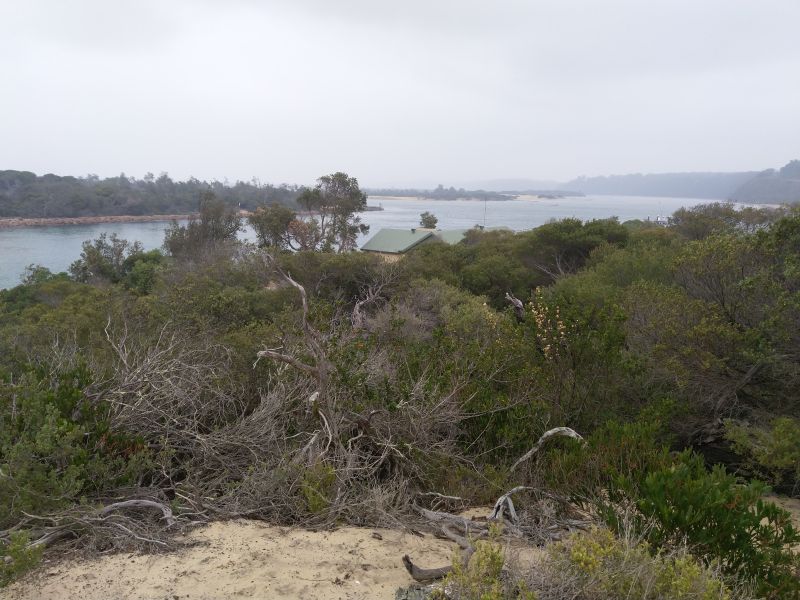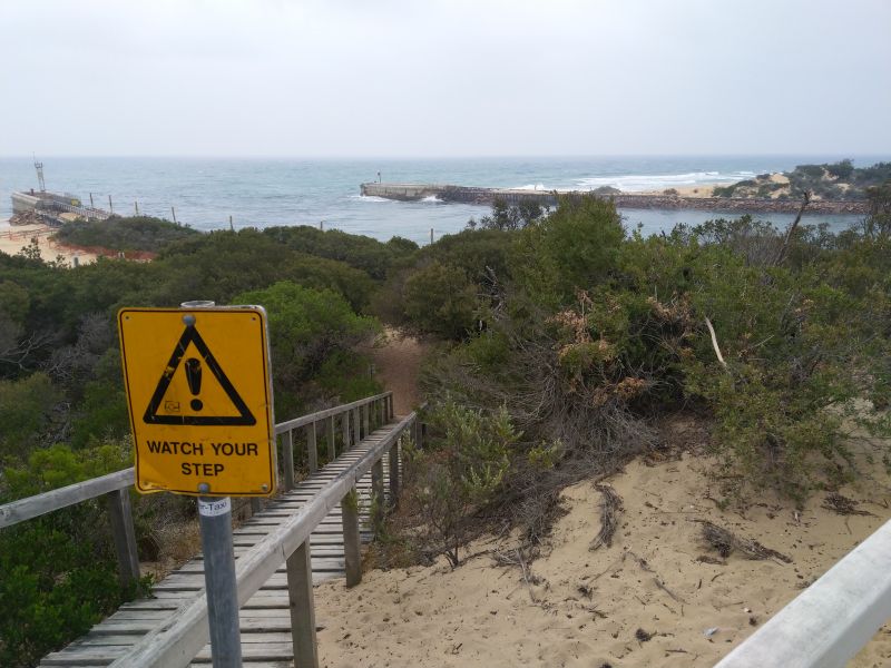 Lakes Entrance gehen wir über die Fußgängerbrücke auf die vorgelagerte Landzunge. Dort beginnt der Walk. Als erstes sehen wir ein "CLOSED"-Schild; können uns allerdings keinen rechten Reim drauf machen und laufen einfach los. Es ist unglaublich was auf purem Sand alles wachsen kann. Es gibt schöne Sträucher mit Blüten, größere Bäume die wir noch nicht gesehen haben und tolle Vögel. Es nieselt etwas.