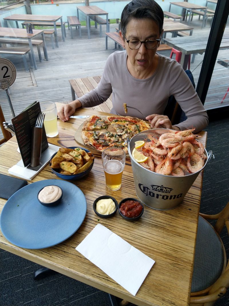 Bis zum Essen verschanzen wir uns im Bus. Es ist echt kalt. Wir machen uns sogar einen heissen Tee! Gegen kurz nach 5 laufen wir los und schaun uns noch etwas die Nachbarschaft an. Hier gibt es wirklich tolle Häuser. Die Meisten mit riesigen Veranden und Fensterfronten. Mal sind sie eher traditionel, mal sehr stylisch. Das Restaurant ist recht leer, aber viele Tische vorreserviert. Das haben wir an einem Donnerstagabend HIER nicht erwartet. Man bestellt am Tresen und bezahlt auch gleich - sehr praktisch. Hinterm Tresen steht eine Irin aus Dublin die mit einer Band hier ist und sich zusätzlich Geld verdient. Interessant dass auch sie die Aussiesprache nicht immer versteht. Elke nimmt eine Lammpizza mit einem Applecider und ich bestelle das Prawn-Basket mit handgeschnitzten Pommes - dazu ein Pale Ale. Was das mit dem Basket auf sich hat sieht man sehr gut auf dem Bild. Ich habe zwar nicht gezählt, aber 50 waren es mindestens. Boah, nicht schlecht und super frisch. Das ganze für 20$ (~14€)! Das Lokal füllt sich zusehends und wird am Ende proppenvoll.