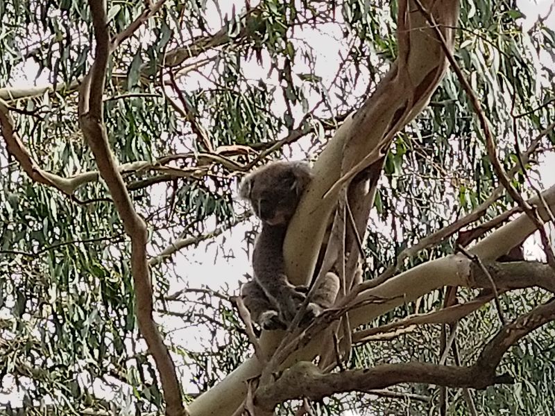 Wieder am Visitorcenter schauen Alle einen Baum hoch. Da sitzt in luftiger Höhe ein weiterer Koala. Außerdem streunen noch 2 Emus durchs Gelände. Besonders scheu wirken die aber nicht :-).