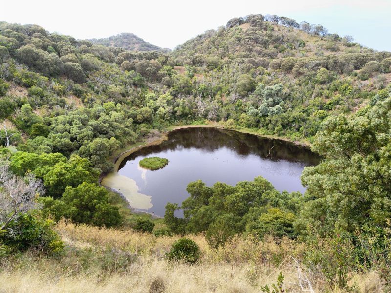 Tower Hill. Den Flyer hatten wir aus der Touriinfo in Port Cambell mitgenommen. Der Park kostet nichts und bietet einige Walks an. Er liegt in einem erloschenen Vulkan und wurde 1960, nachdem man alles abgeholzt hatte, wieder aufgeforstet und ist seit dem unter Naturschutz gestellt. Wir starten mit dem weitesten Weg, der auch um einen kleinen Kratersee führt.