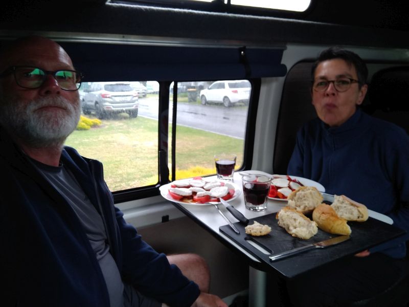 Auf dem Rückweg zum Campingplatz tanken wir noch und gehen im Wooly für heute Abend einkaufen. In einer Cheeserei haben wir gestern Büffelmozarella gekauft. Den gibt es heute auf Tomate bzw. Möhrchen und Paprika. Wir machen einfach den Heizpilz im Camper an und ziehen (mal wieder) alle Klamotten an die wir mit haben.....