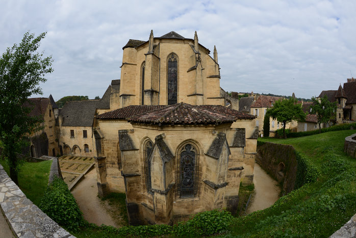 Da heute weder Feiertag, Ausflugstag noch Sonntag ist besuchen wir nochmals Sarlat. Außerdem ist heute kein Markttag und das Wetter deutlich besser als letzten Samstag. Der frühe Vogel fängt den Wurm und wieder einen kostenlosen Parkplatz. Noch sind nicht viele Touris da. Dafür sind es heute die Handwerkerautos die überall malerisch herumstehen. Nach und nach wird es auch voller und 360°-Panoramen wollen nicht so recht gelingen. Bei einer kompletten Drehung ist immer wieder etwas was dazwischen kommt. Ein Auto fährt ins Bild, oder Fahrradfahrer, oder Passanten die einem plötzlich in die Kamera glotzen. Am Hauptplatz versuche ich es dreimal. Nach einem ausführlichen Rundgang und einem Café am beliebtesten Platz fahren wir am frühen Nachmittag zum Supermarkt unseres Vertrauens und kaufen für 2 Tage ein. Fertige Galette (nordfranzösische Pfannkuchen) mit Ziegenkäse- oder Speckfüllung; dazu Cidre und Salat und zum Nachtisch Fromage Blanc mit Erdbeeren. Und Taboulée (Couscoussalat), Celleriesalat (den Elke nicht mag), Paté de Lapin (Hasenpastete) und 3 verschiedenen Käse. Dazu passende Weine aus der Gegend.