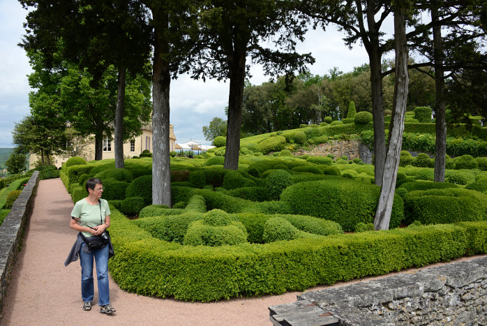 WĂ€hrend wir Kaffee kochen kommt doch tatsĂ€chlich zaghaft die Sonne raus. Also fahren wir zu den GĂ€rten von Marqueyssac. Wörter gibts hier!!! Mit etwas GlĂŒck können wir "unser" HĂ€uschen im Sonnenlicht erleben. Auch diese Gartenanlage ist privat, aber wesentlich gröĂer also die andere die wir uns angesehen haben. Auch hier gibt es massig in Form gebrachte BuchsbĂ€ume, aber in einer viel lebhafteren und unkonventionelleren Art. Die Anlage verlĂ€uft an einem Berghang entlang und man kann sehr hĂ€ufig weit in das Tal der Dordogne schauen. Noch besser wĂ€re es wenn die Sonne sich endlich ganz zeigen wĂŒrde. Aber wir wollen nicht undankbar sein - es ist warm und es regnet nicht. Wir verbringen tatsĂ€chlich volle 3 Stunden dort und gönnen uns zum SchluĂ sogar noch einen Tee und ein BiĂšre AmbrĂ©e. Zum Schluss posiert noch ein Pfau fĂŒr uns.