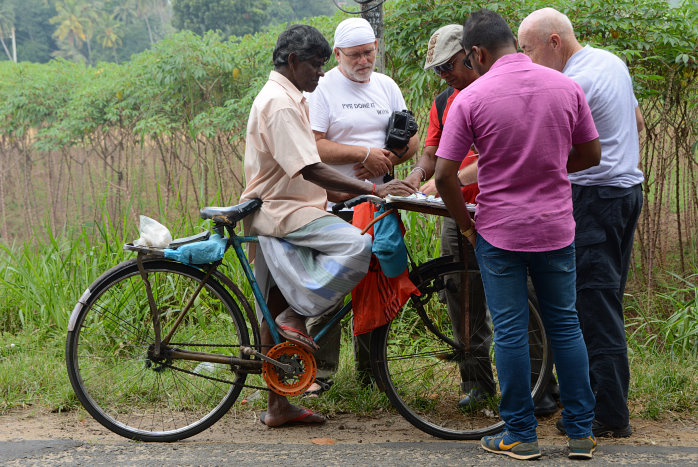 Zuerst müßen wir uns durch Kandy quälen. Obwohl - heute ist Feiertag (Deepavali-Fest) und deshalb sind die Strassen nicht ganz so voll. Unsere Strecke ist nur 80km lang, aber es wird sehr bergig und kurvig. Die Landschaft ist von Teeplantagen und Gemüsefeldern geprägt. Unterwegs ist dann an einem Stand schon Mal eine Stärkung mit Jackfrucht nötig. Sumi kauft eine kleine Tüte davon, streut Pfeffer darüber und dann dürfen wir eine nehmen. Sie ist etwa so groß wie 2 Finger dick, gelb und hat einen dicken Kern innendrinn. Den muss man rauspopeln bevor man es isst. Schmeckt ein wenig nach Ananas. Einen weiteren Stopp fordere ich ein, weil wir zwar dauernd an Flughunden in Stromleitungen hängend vorbeifahren, aber noch keinen fotografiert bekommen haben. Zufällig kommt ein Losverkäufer auf seinem Fahrrad vorbei und wird sofort umringt. Lose kaufen ist Volkssport. Das sieht man überall.