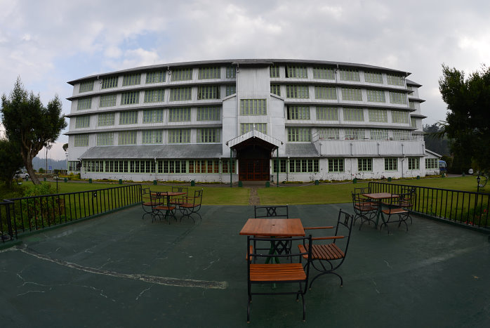 Die Eingangshalle ist toll, wirklich wie in einer Fabrik. Den alten Aufzug mit den beiden Eisengitterschiebetüren werden wir später auf jeden Fall testen. Eigentlich ist der Programmpunkt Teepflücken im Sari angesagt, aber Thomas und ich wollen das Licht noch etwas nutzen und laufen deshalb los und erforschen lieber die Umgebung des Hotels. Direkt am Geländeeingang steht der Generator des Hotels. Zwei Angestellte sind gerade da und so kann ich gleich ein paar Fachfragen loswerden. Die beiden freuen sich, dass sich endlich mal einer für sowas interessiert. Auf dem Rückweg laufen uns allerdings einige ziemlich betrunkene Jungs über den Weg, die Deepavali gefeiert haben. Zweie schlagen sich sogar. Zurück im Hotel genießen wir einen Tee mit Blick aus unseren beiden Panoramafenstern.