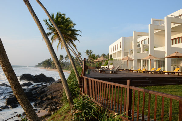 In Bentota finden wir dank Handykarte und GPS eine kleine Strasse zum Strand. Irgendwann ist es nur noch ein Weg, aber ein netter älterer Herr bestätigt uns richtig zu sein. Man müsse nur noch über die Bahngleise und über den Hotelparkplatz. Das Hotel erweist sich als Riesenkomplex in dem man verdächtig häufig russisch hört. Auch die meisten Werbeplakate von Hotels sind auf russisch. Es gibt sogar eine elektronische Laufschrifttafel die nur russische Texte anzeigt. Wir finden den Strand und laufen ihn ein wenig entlang. Hier ist Hotel an Hotel. Alle sehr edel, groß und wahrscheinlich dementsprechend teuer. Es ist gar nicht so leicht vom Strand wieder runterzukommen ohne durch ein Hotel zu laufen. Wieder, OSM-Fummelhandykarte sei Dank, finden wir einen Ausweg. Nun wird es Zeit für einen frischen Saft. Selbst Elke hat einen roten Kopf. Heute ist es extrem heiss und feucht. Eklig babbisch.