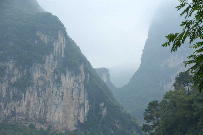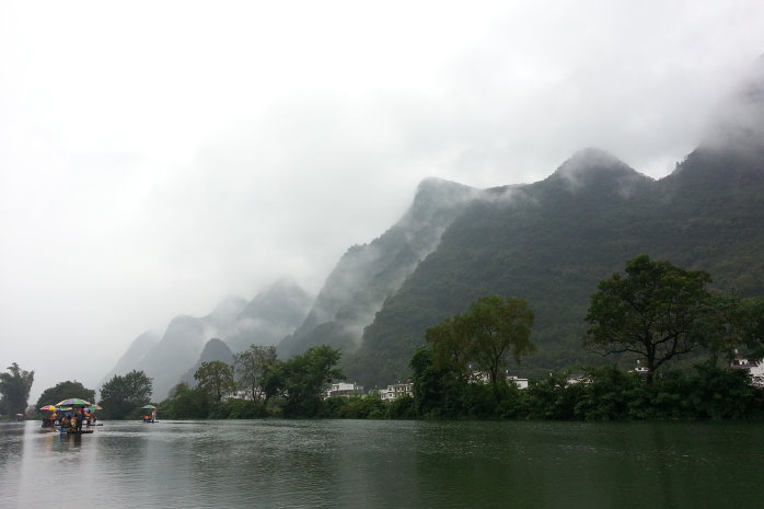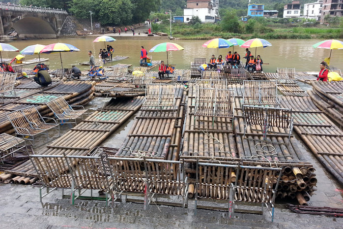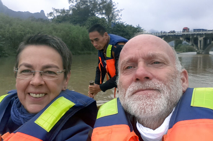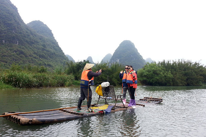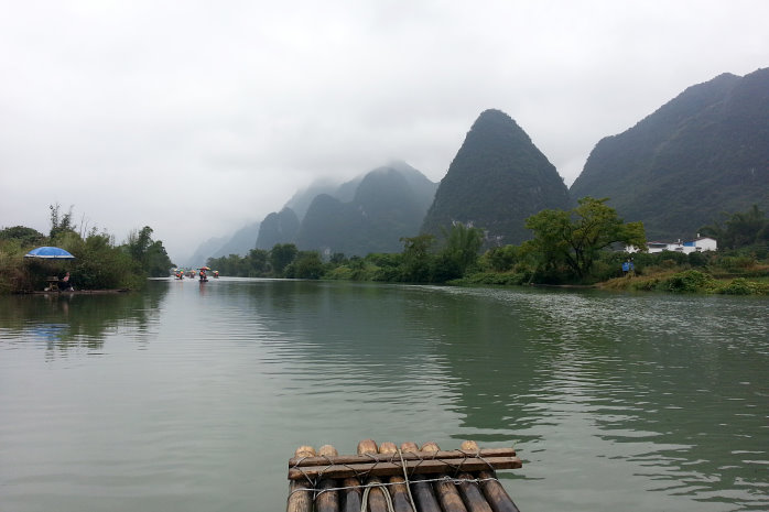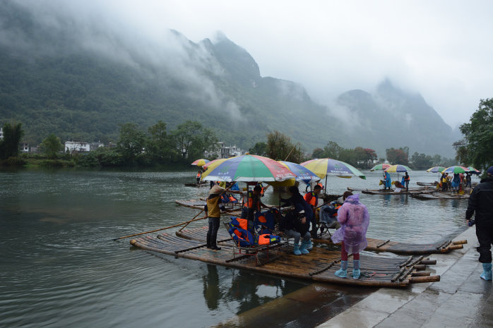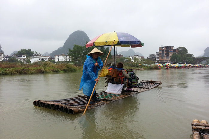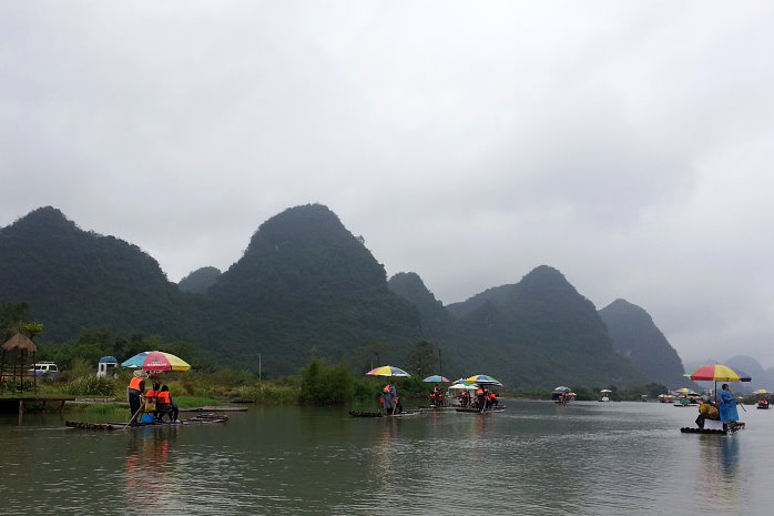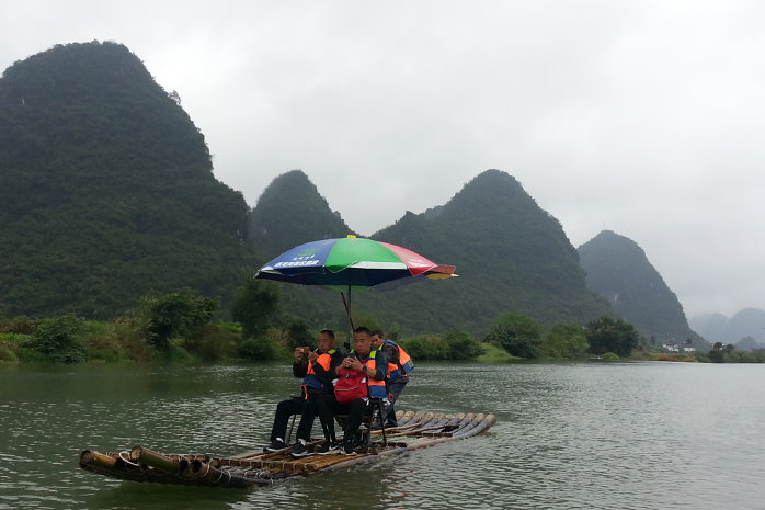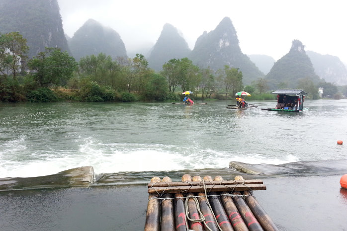 Nach einem Frühstück mit gutem Kaffee und gebratenen Nudeln geht es los. Wir fahren zum Yulong-Fluss, es regnet nicht! Das ist doch schon mal was. Die Flöße sind aus dickem Bambus der mit Draht zusammengebunden ist. Darauf ist eine Bank für 2 Personen gestellt. Wir bekommen unser Floß zugewiesen, ziehen brav die Schwimmweste an und schon geht es los.