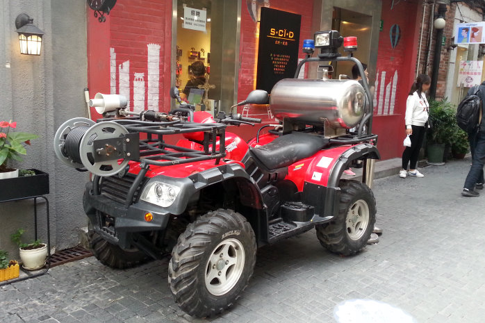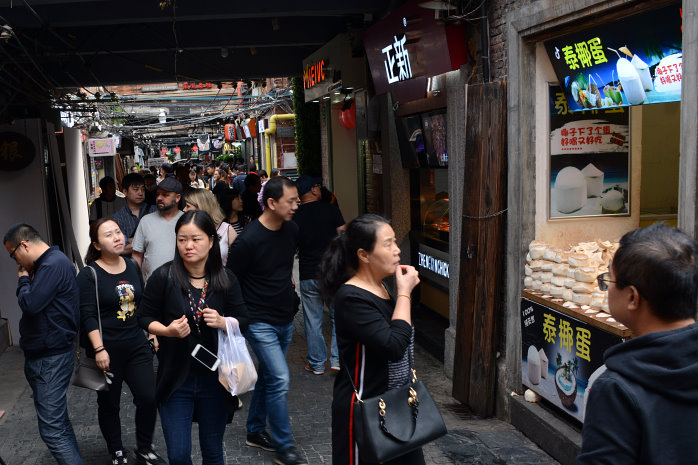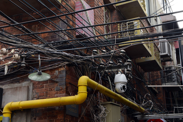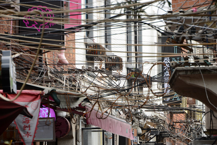 Zurück an der U-Bahn fahren wir mit der Linie 9 bis Dapuqiao zum Viertel der "Französischen Konzession". Hier gibt es alte Häuser zu sehen. Allerdings sieht man die nicht da in jedem der Häuser ein Geschäft ist. Ein ganzes Viertel Drosselgasse². Nur Touris und fast nur Nippes, mit ganz wenigen Ausnahmen – also so richtig authentisch. Das Interessanteste ist die Stromversorgung. Die scheint noch aus vorchristlicher Zeit zu sein :-). Funktioniert aber!