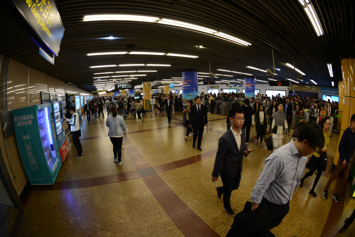 Nach einem üppigen Frühstück, heute etwas später, fahren wir mit der U-Bahn. Die Station liegt schräg gegenüber des Hotels, aber man muss dazu vielbefahrene mehrspurige Straßen überqueren. Hierzu gibt es einen hochgelegenen Fußgängerkreisel mit Rolltreppe. Nur nicht zu viel bewegen. Laufen auf Rolltreppen ist bei Chinesen verpönt. Zumindest haben wir nie jemanden laufen sehen.