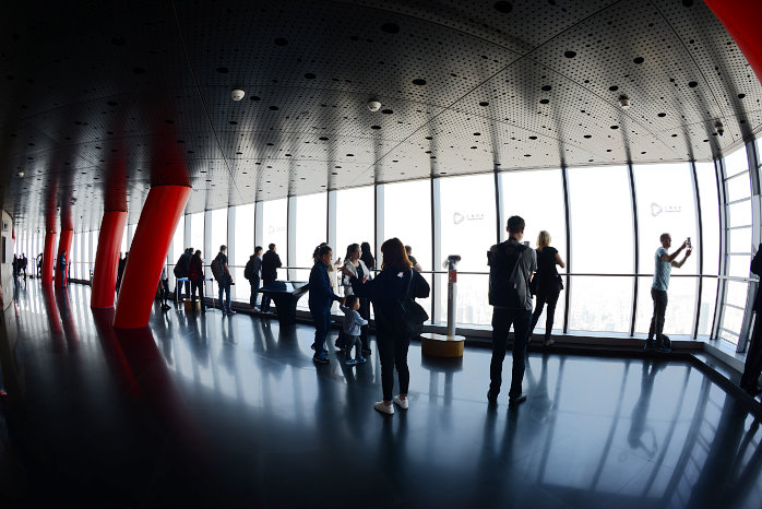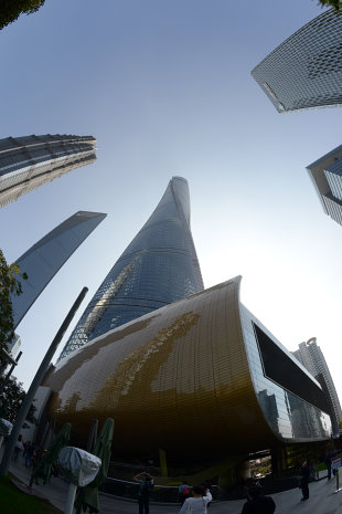 Kun kauft für uns Tagesausweise zu 14Yuan – ein Spottpreis. Auch hier sind wieder Sicherheitskontrollen, wie in allen anderen U-Bahnstationen auch. Nun fahren wir gut instruiert zur Station Century Avenue. Dort laufen wir durch ein Einkaufszentrum, weil das der kürzeste Weg zum Shanghai Tower, dem zweithöchsten Gebäude der Welt, ist. Dort im 119.Stock ist die Aussichtsterrasse, natürlich hinter Glas. Der Aufzug bringt 18 m/s maximal, was ganz schön schnell ist. In 552m Höhe steigen wir aus. Wow, was für eine Aussicht. Etwas diesig, aber beeindruckend. Die Ausdehnung der Shanghaier Innenstadt von 20×25 Kilometern kann man fast erahnen. Knapp eine Stunde lang laufen wir rum und können uns gar nicht satt sehen.