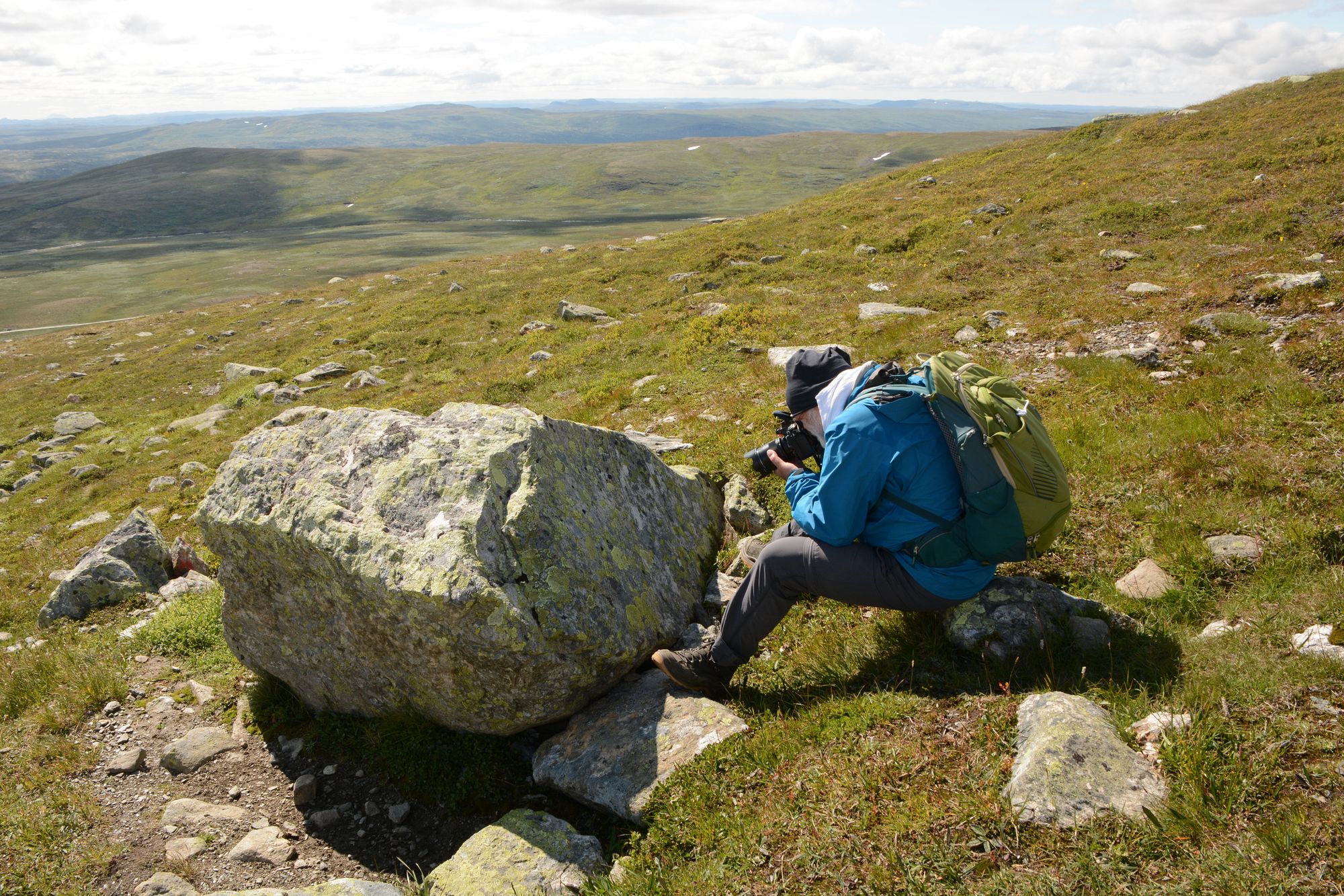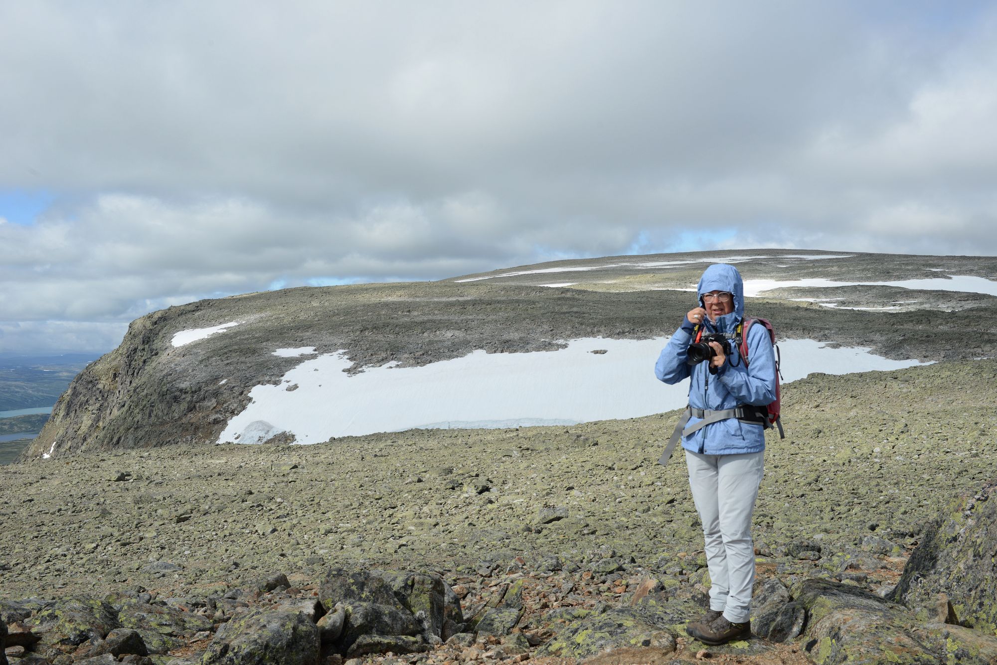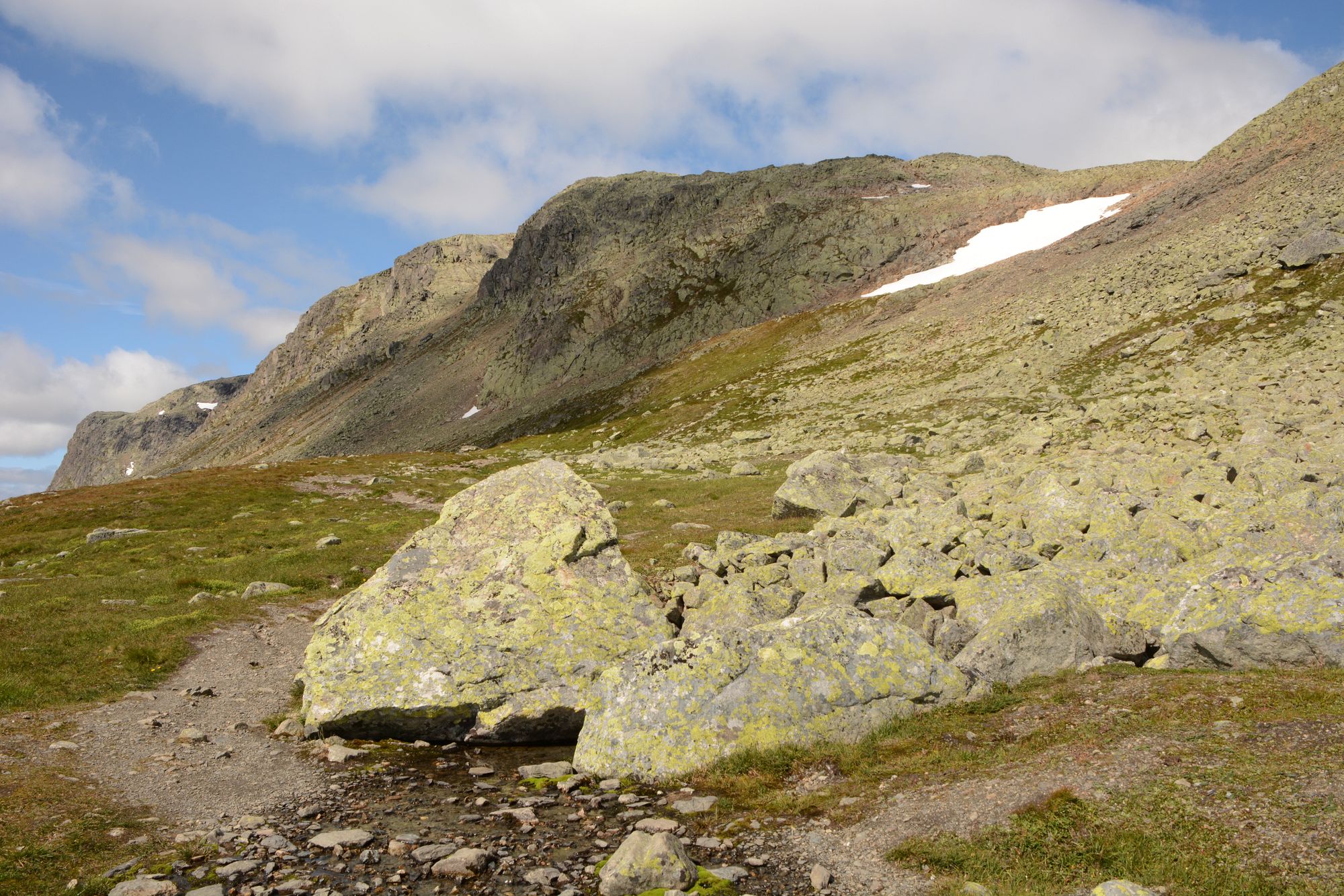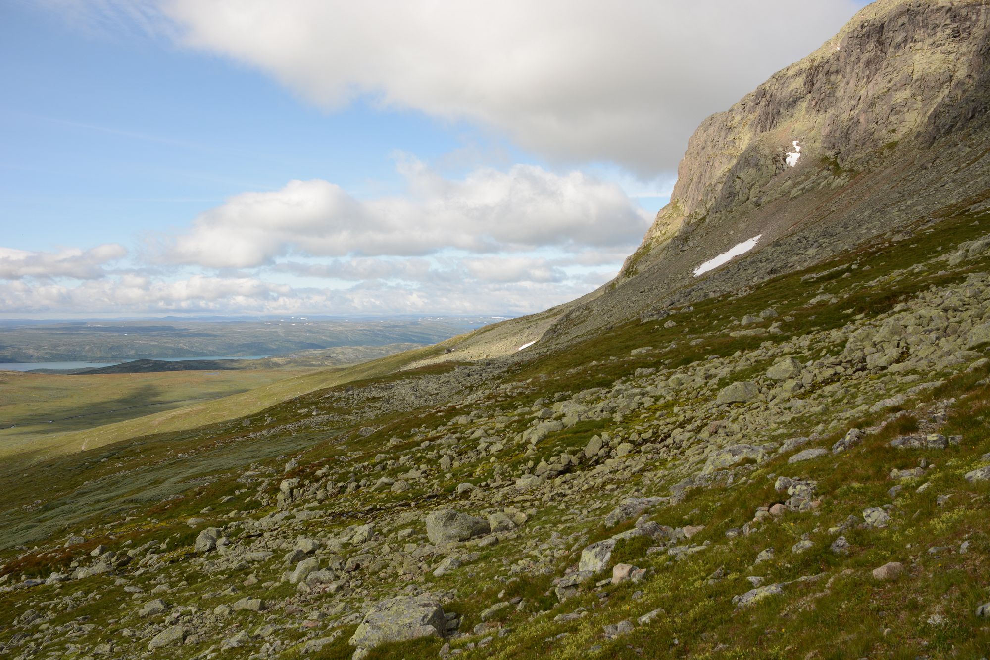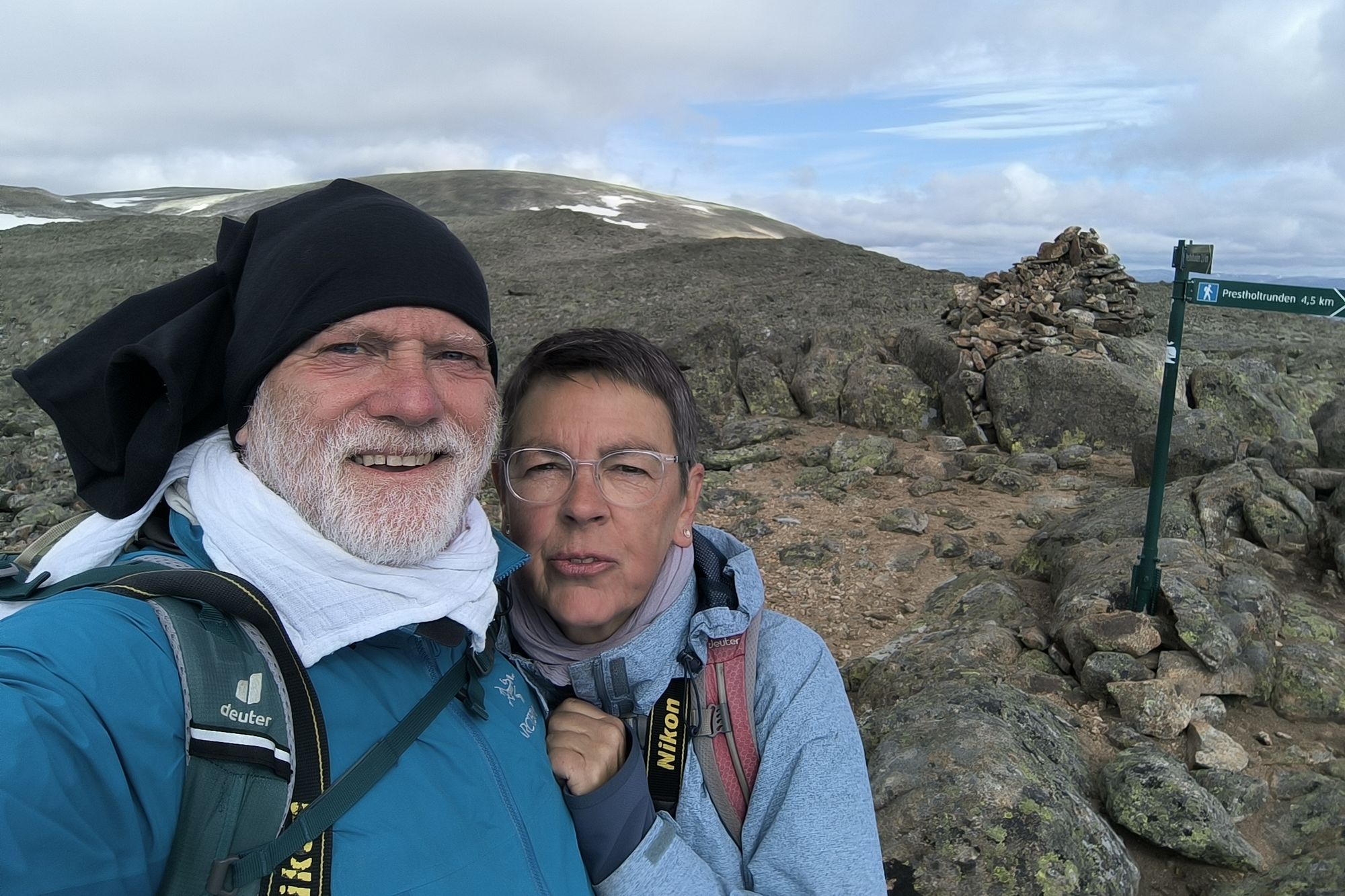 Heute Morgen ist es schon wieder sonnig. Also beschliessen wir die Wanderung 'Prestholtseter-Runde' zu machen. 1240m auf 1705m (475 rauf und wieder runter in Summe), 6,6km über 3 Stunden. Anhand der Daten sieht man schon, daß es schwierig zu sein scheint. Die Wanderung beginnt 11km vom Hotel entfernt den Berg hoch.