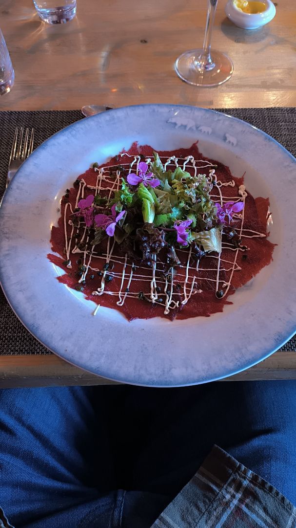 In Geilo trinken wir einen Café und reservieren im teuersten Restaurant einen Tisch. Es gibt da aber auch leckere Sachen, z.B. Walcarpacchio. Ich hoffe, die haben das auch heute Abend.