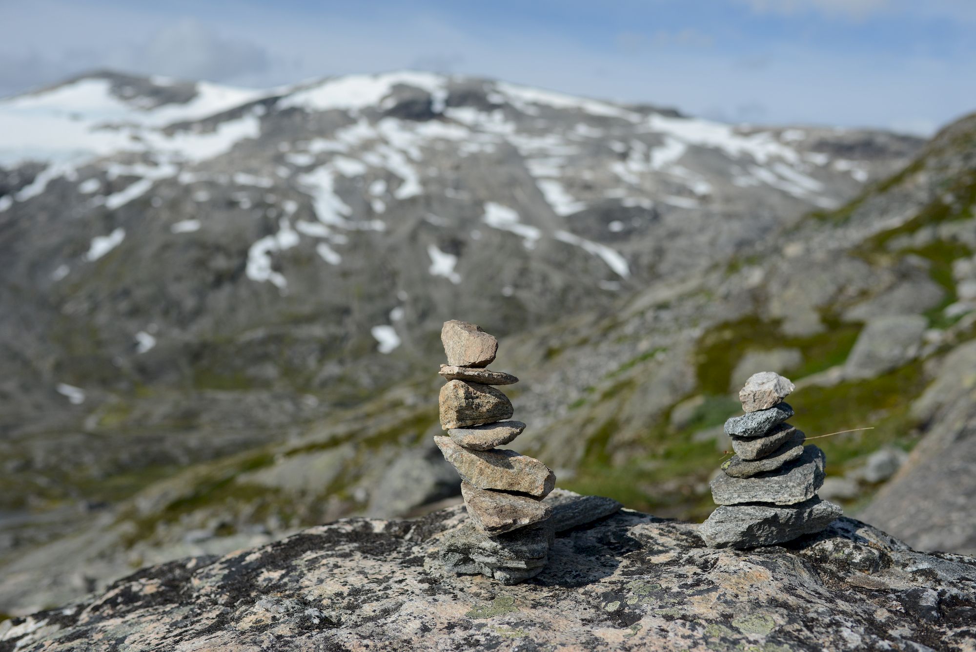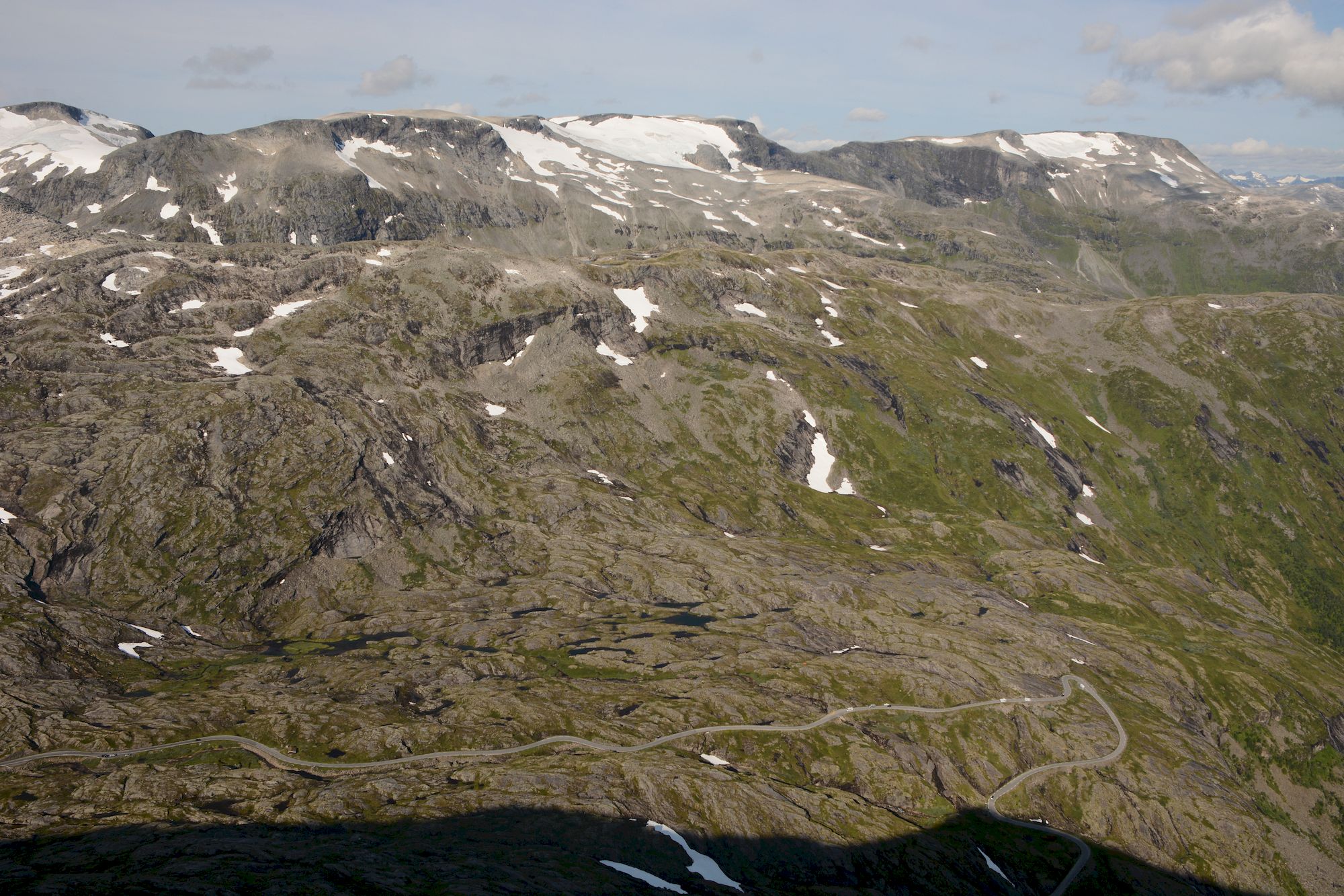 Dalsnibba (1476m) ist eine Mautstrasse und kostet 330NOK. Das ist es aber echt wert, denn der Ausblick von oben auf den Geirangerfjord, aber vor allem auf die grandiose Bergwelt, ist wirklich klasse. Nicht umsonst heisst das auch Skywalk. Wir drehen eine Runde und sind hin und weg. Ein einziges, kleines Kreuzfahrtschiff liegt heute unten im Fjord, obwohl es so beschrieben ist, dass da dauernd richtig viele ankern.