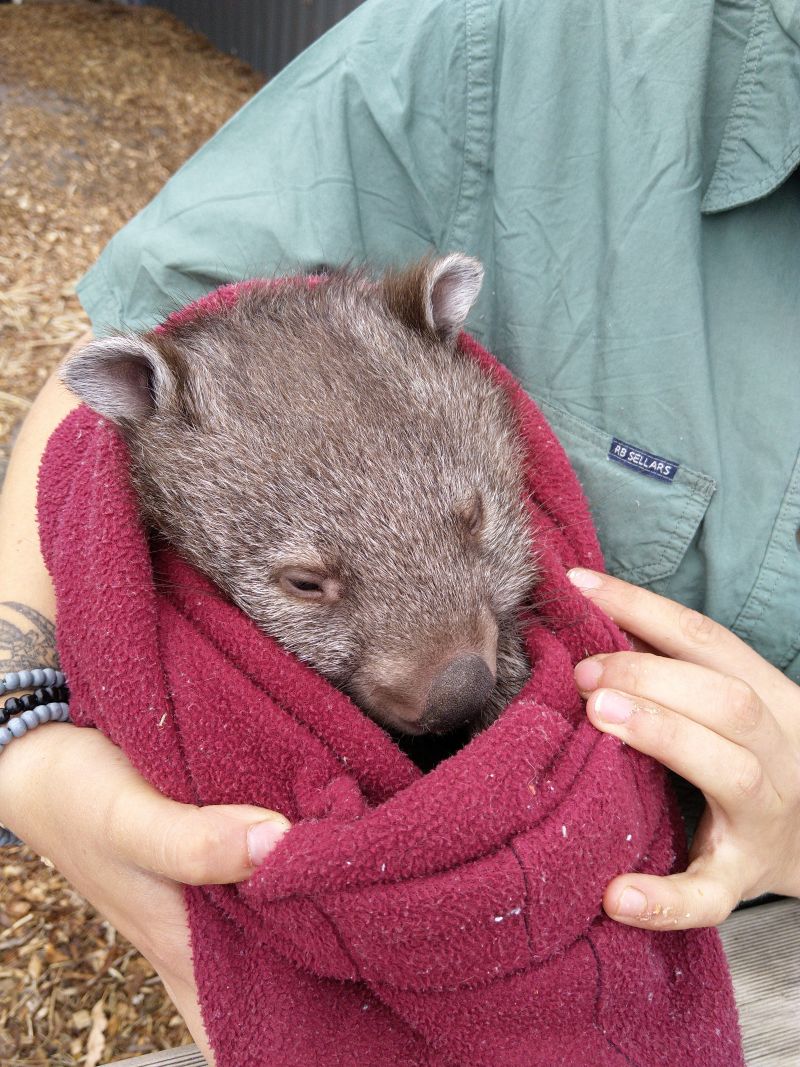 Danach führt er uns zu einem anderen Gehege in dem 2 kleine Kängurus sind. Dort steht eine Pflegerin mit einem kleinen Wombat in einem Stoffbeutel. Es sei 8 Wochnen alt, Waise und ein Mädchen. Sie nimmt es Abends immer mit nach Hause zum füttern. Wir dürfen es alle mal streicheln. Einfach klasse. An der Kasse haben wir auch etwas Futter gekauft. Das wollten wir eigentlich nicht, aber die 2 $ haben den Eintritt auf 50$ aufgerundet. Nun können wir es den 2 Kängurus geben. Sie halten sich mit den Vorderpfoten an unserer Hand fest und fressen uns aus der hohlen Hand. Komisches Gefühl, aber total süß.