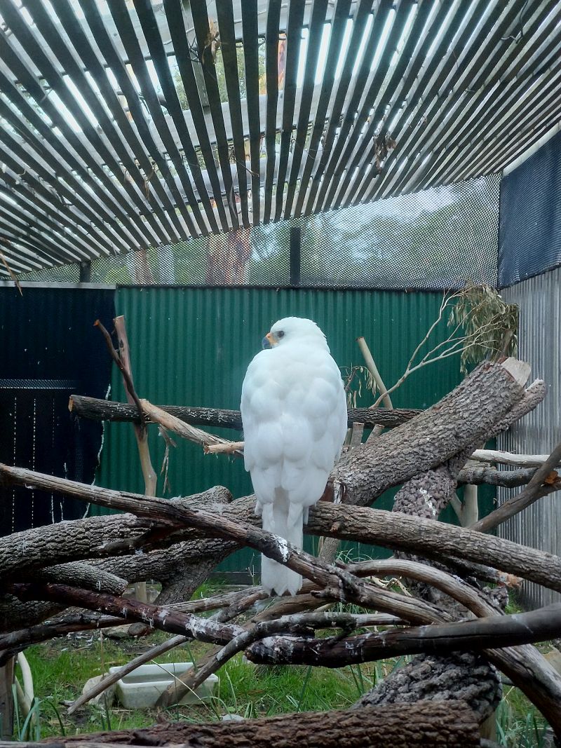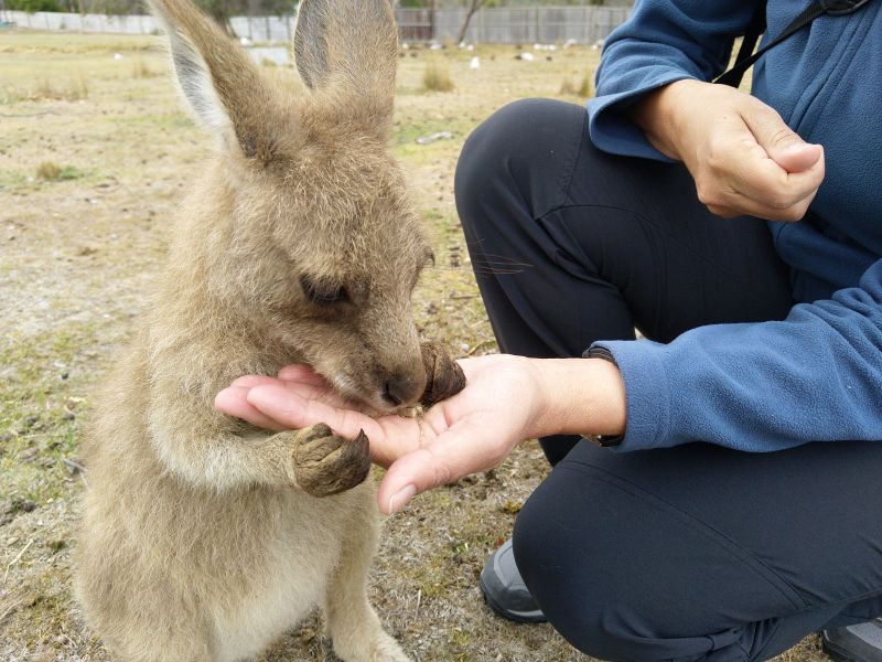 Der Park hat aber auch noch andere Tiere. In einer großen Voliere gibt es die verschiedenen Kakadus hautnah. Auch 2 Adler mit verletzten Flügeln sitzen auf einem Baum. In einem weiteren Gehege sind Pademelons. Eines davon ist so aggressiv am betteln, dass es mich beim füttern durch die Fleecejacke kratzt. Alle anderen Wallabies sind eher zurückhaltend.