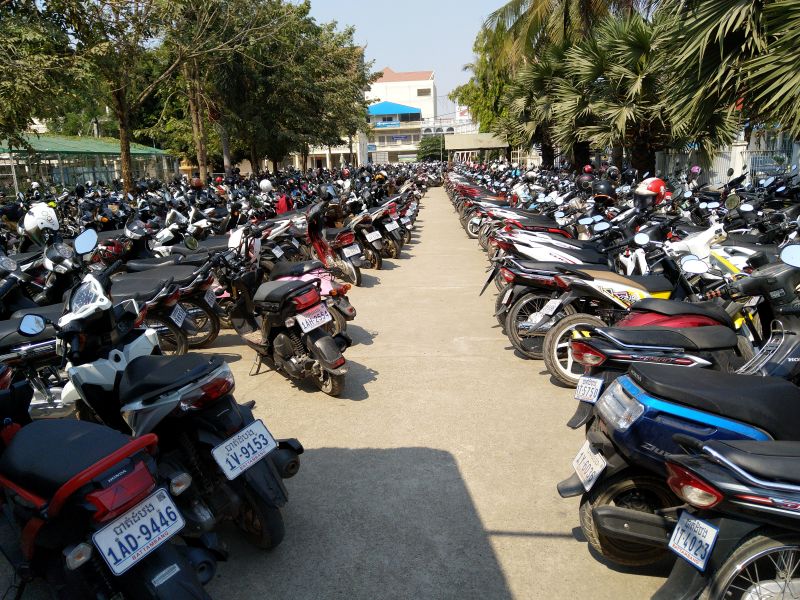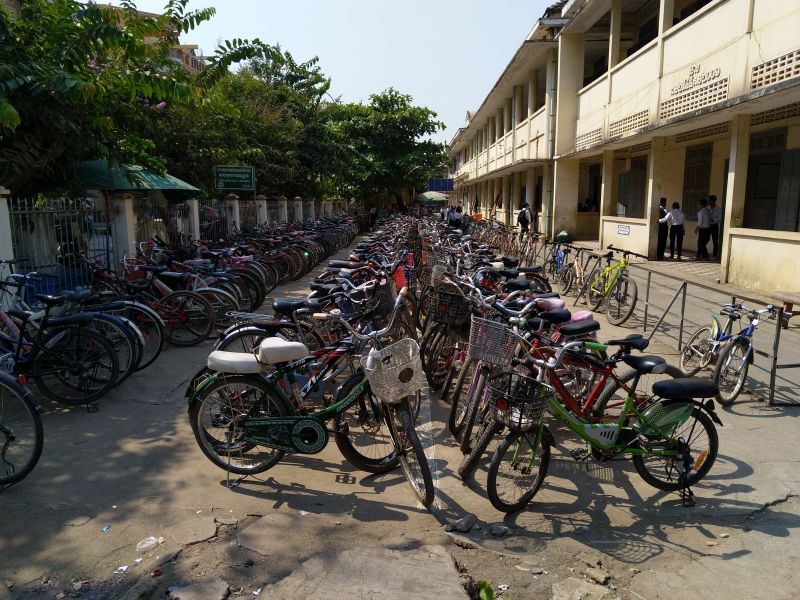 An einer Schule mache ich untenstehende Bilder. Jeder kommt hier mit Moped oder Fahrrad zur Schule. Manche sind eindeutig zu jung fürs Moped - interessiert hier aber keinen. Apropos Schule: es gibt 2 Schichten. Die Erste von 7-11 und die Zweite von 13-17 Uhr - jeweils unterschiedliche Kinder! Die Klassen sollen laut unserer Guides bis zu 60 Kinder stark sein - ein Lehrer!