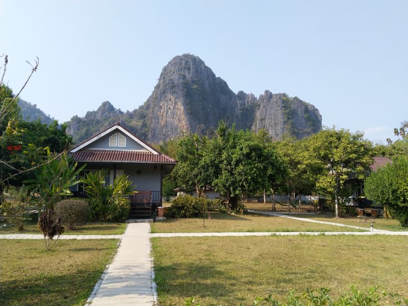 Dann wird es richtig lustig. Die Straße ist sehr viel kurviger und bergiger als der letzte Abschnitt. Wir werden ganz schön hin- und hergerüttelt, aber die Landschaft wird schöner. Es geht in ein Gebiet mit Karstbergen. Die Bilder im Internet waren überzeugend. Kurz nach 1 sind wir in Vang Vieng angekommen. Die Hotelbeitzer haben uns eine Mail mit ihrer Telefonnummer geschickt, die wir zum Abholen lassen nutzen können. Das Bearlin Bungalow wird von Laoten geführt die 30 Jahre in Berlin gewohnt haben. Wir fahren über den Nam Song über eine private Brücke für die man bezahlen muß.