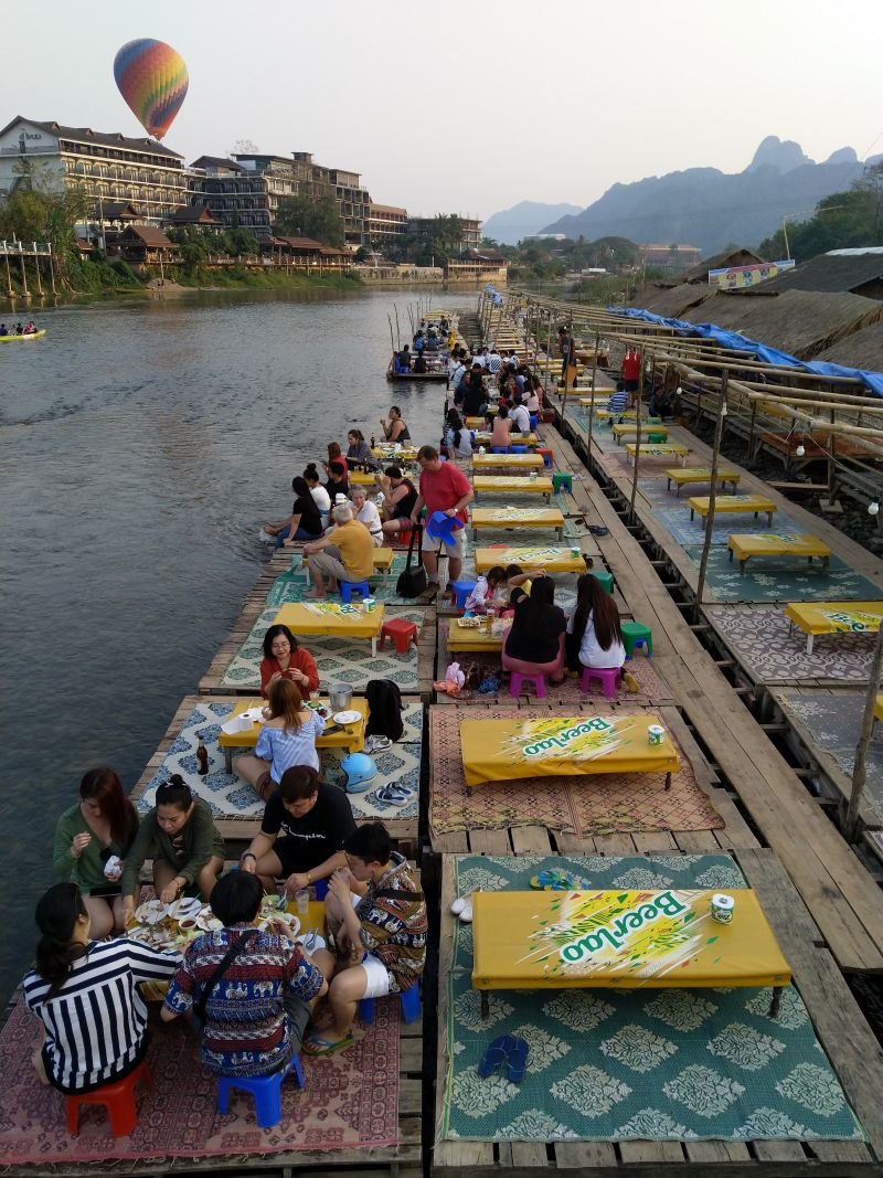 Auf einer staubigen Straße kommen wir ans Ufer. Oha. Man kann hier am Ufer und auch im Wasser sitzend speisen. Alle paar Meter wechselt die laute Musik. Auf dem Wasser paddeln Touris oder lassen sich knatternd kutschieren. Auf der schmalen, kostenlosen Holzbrücke muss man ganz schön acht geben. Die Mopeds nutzen sie auch.