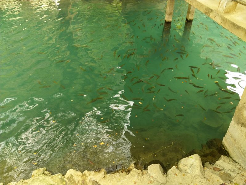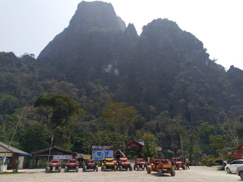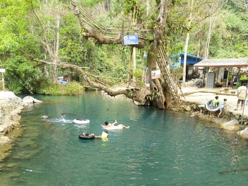 Bei Lagune No 2 jedoch bezahlen wir nochmal den obligatorischen Betrag. Als wir ankommen sind wir fast die einzigen und das kühle, klare Wasser ist eine herrliche Erfrischung. Dann kommt ein ganzer Trupp (Vietnamesen?) mit Buggies an und wir machen uns wieder auf den Weg. Allerdings müßen wir kurz darauf deren Staub schlucken. Unsere Vermutung ist, dass die Straße deswegen so bleibt, damit das Buggyfahren mehr Spaß macht. Bis auf etliche Schulkinder und drei andere Touris sind wir die einzigen, die hier mit dem Fahrrad unterwegs waren.
