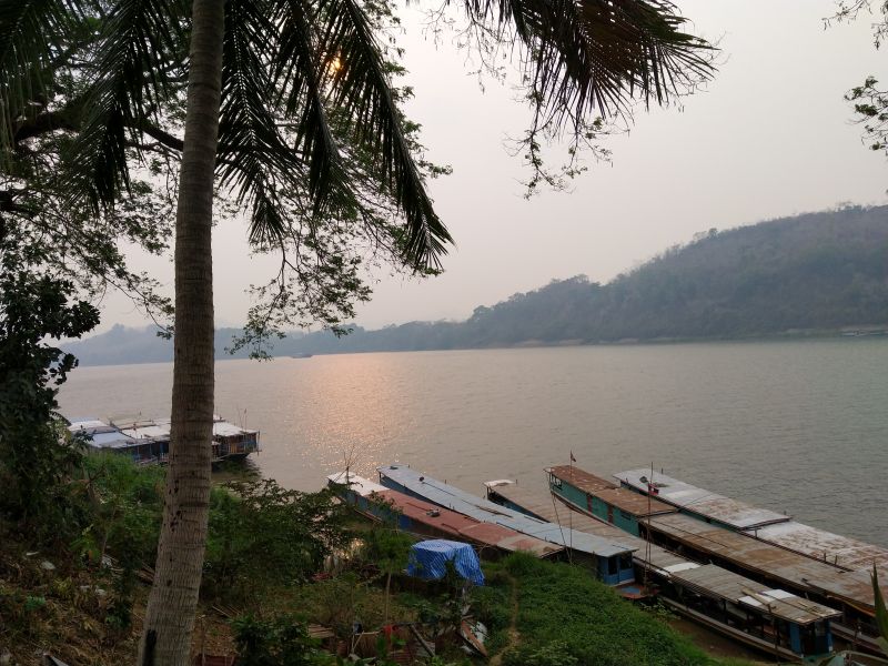 Wir stehen um 6 Uhr auf, weil da der Almosengang der Mönche sein soll. Bei unserem ersten Mal hier war das schon sehr beeinruckend. Aber schon nach wenigen Metern sehen wir, dass wir zu spät sind. Einige kommen uns mit Kameras entgegen. Mist - wäre also noch früher. Wo wir schon auf sind bezahlen wir für den Aufstieg, 328 Stufen, auf den Phousi 20000/Person. Der Phousi ist eine Erhebung mitten in der Stadt mit einem Wat oben drauf. Wenn nicht gerade der Dunst so dick ist wie heute könnte man schön über Luang Prabang sehen. Bereits verschwitzt gehen wir zum Frühstück. Nicht ohne vorher auf dem Morgenmarkt eines der Messer zu kaufen, was ich beim letzten Mal leider verpasst hatte.