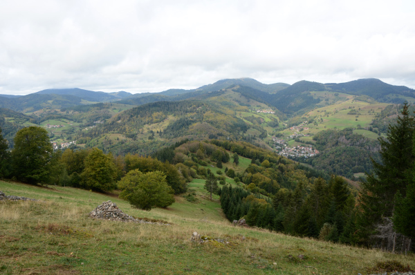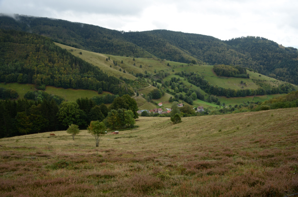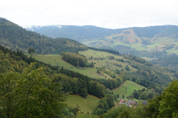 Es soll erst ab dem späten Nachmittag regnen (komisch irgendwie: es ist ständig von Regen die Rede, bisher hatten wir aber höchstens ein paar wenige Tropfen), also wandern wir ab Schönau. Eine ganze Weile immer bergauf nach Tunau und darüber hinaus. Auch wenn es bewölkt ist haben wir immer wieder schöne Ausblicke. Am Zweistädteblick sieht man Schönau und wenn man sich ein bißchen den Hals verrenkt auch Todtnau. Vor allem aber hat man einen sagenhaften Blick auf den Belchen und die Hügel und Täler drum herum.